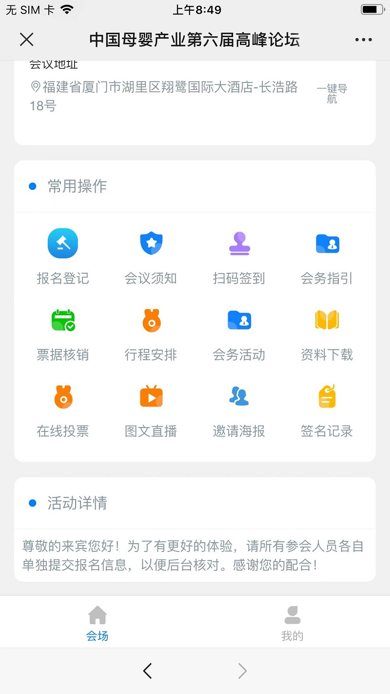 會議使用的功能有:報名登記、會議須知、掃碼簽到、會務(wù)指引、票據(jù)核銷、行程安排,會務(wù)活動,資料下載,在線投票,圖文直播,邀請海報,簽名記錄。