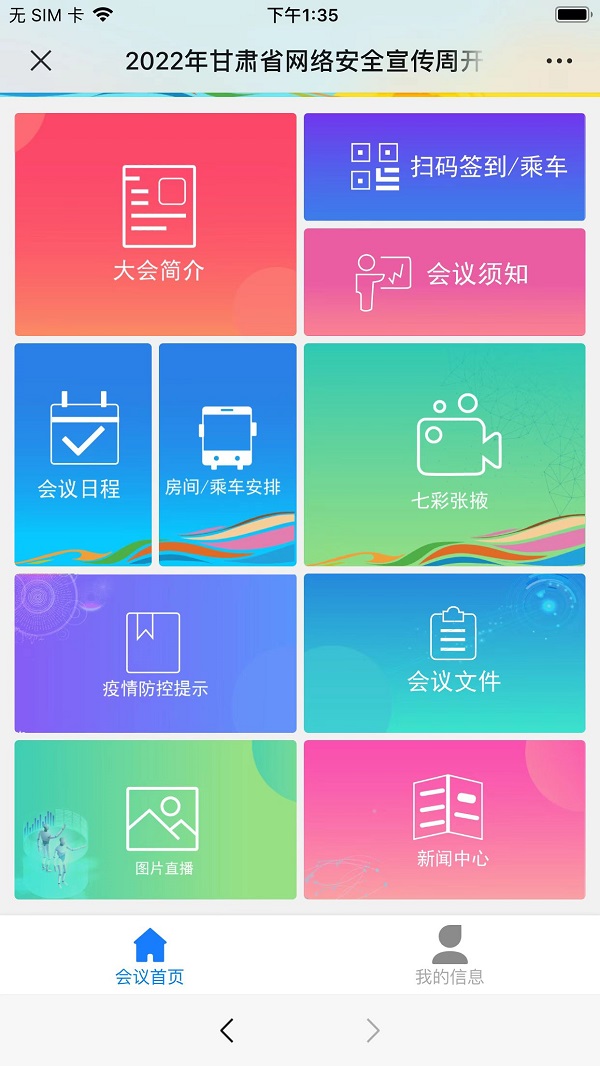 會議包括大會簡介,掃碼簽到/乘車,會議須知,會議日程,房間/乘車安排,七彩張掖,疫情防控提示,會議文件,圖片直播,新聞中心。