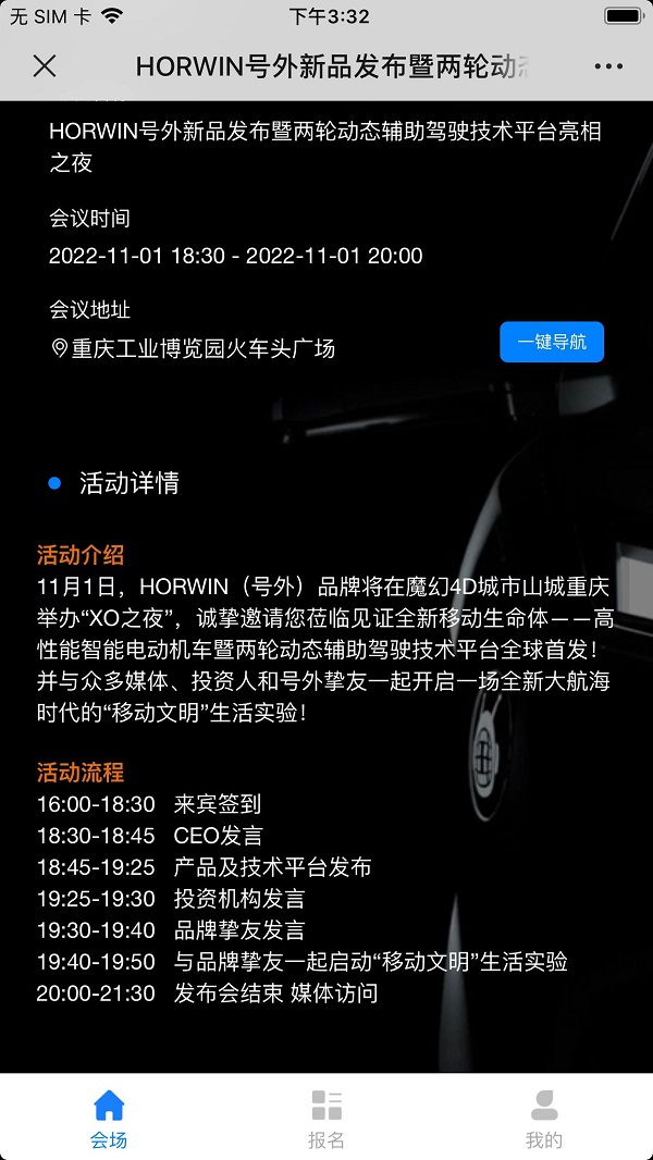 HORWIN號外新品發(fā)布暨兩輪動態(tài)輔助駕駛技術(shù)平臺亮相之夜于2022年11月1日在重慶工業(yè)博覽園開展,會場全程使用會助力智能會務(wù)系統(tǒng)。