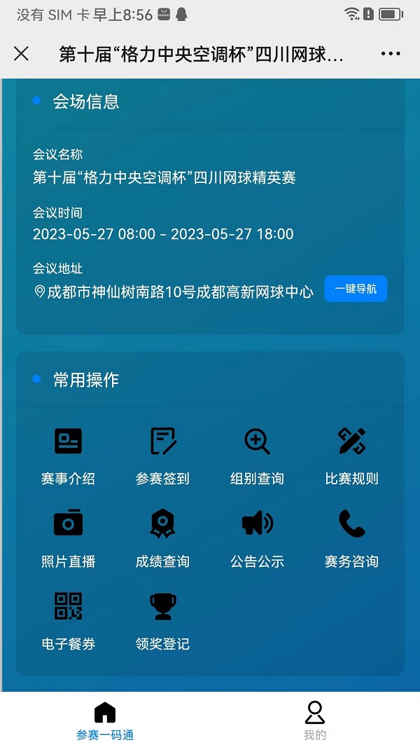 常規(guī)操作包括賽事介紹,參賽簽到,組別查詢,比賽規(guī)則,照片直播,成績(jī)查詢,公告公示,賽務(wù)資訊,電子餐券,領(lǐng)獎(jiǎng)登記等信息。