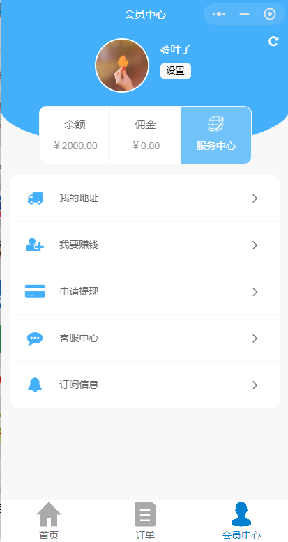 我的,會(huì)員中心可以查看我的地址,我要賺錢,申請(qǐng)?zhí)岈F(xiàn),客服中心,訂閱消息。